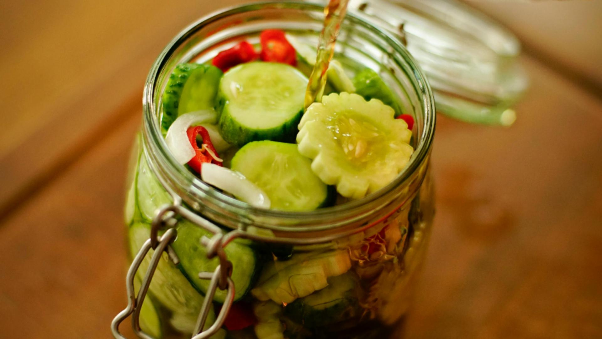 Într-un vas se pun la fiert în 2 l de apă, oțetul, zahărul și boabele de piper. Când începe să fierbă, punem legumele tăiate și le dăm în 2-3 clocote, după care se scot cu ajutorul unei spumiere pentru a se scurge, le punem într-un bol încăpător și le lăsăm să se răcească.
