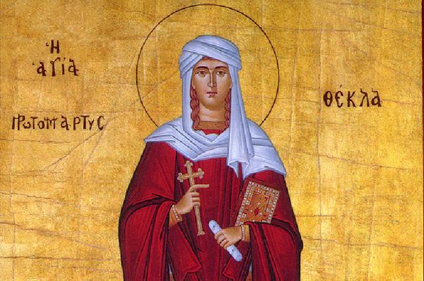 Sfânta Tecla, considerată „întocmai cu Apostolii”, a fost ucenica directă a Sfântului Apostol Pavel. Născută în cetatea Iconiei, la doar 18 ani și logodită cu Tamir, ea a ales să-L urmeze pe Hristos, renunțând la viața lumească. A fost aruncată în foc și dată fiarelor sălbatice, dar a fost izbăvită prin puterea lui Dumnezeu. Timp de decenii a propovăduit credința, atrăgând mulți la Hristos, iar la vârsta de 90 de ani și-a încheiat viața în rugăciune și sfințenie.